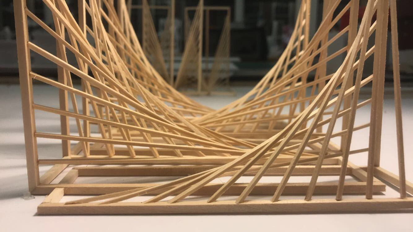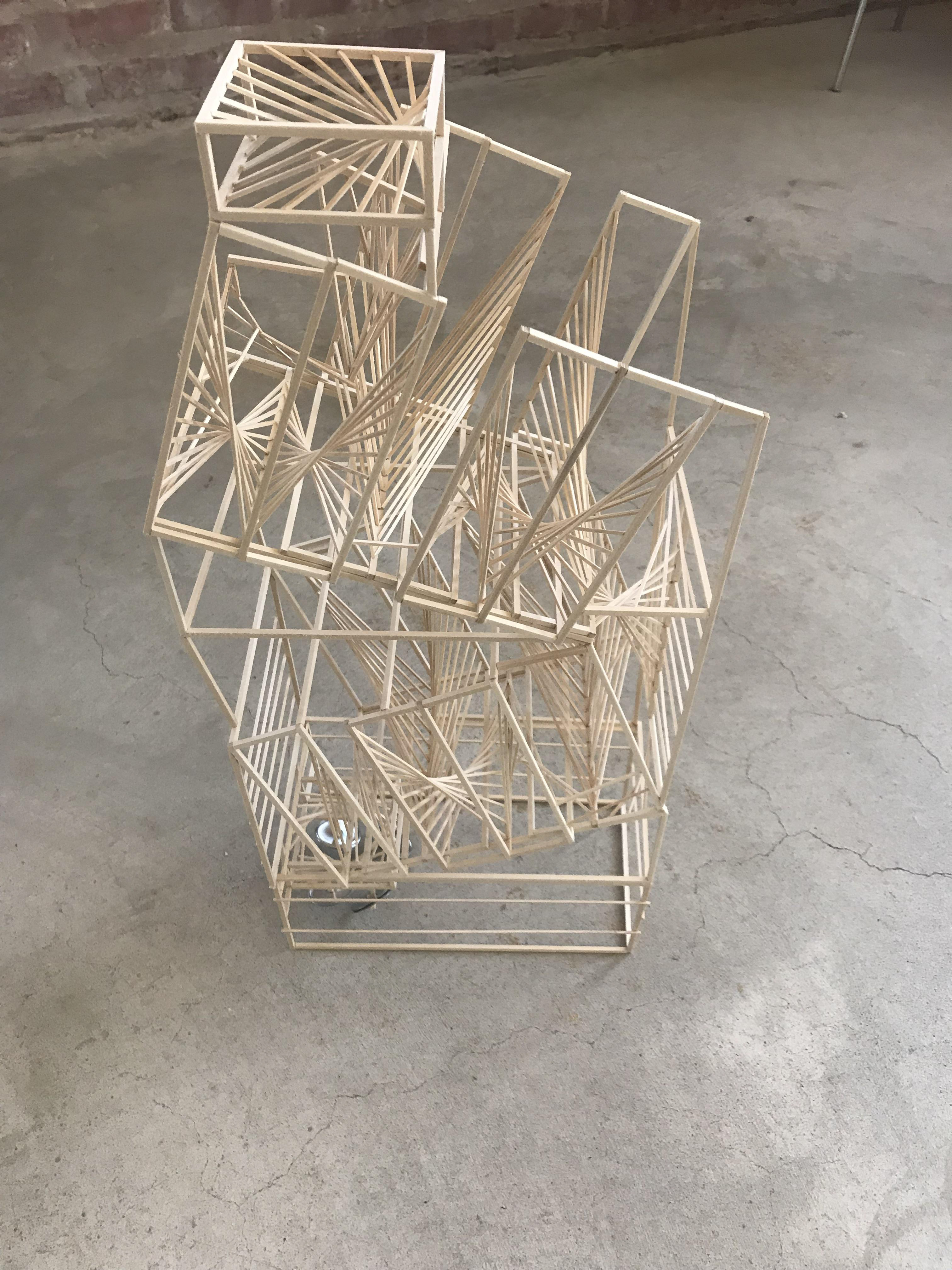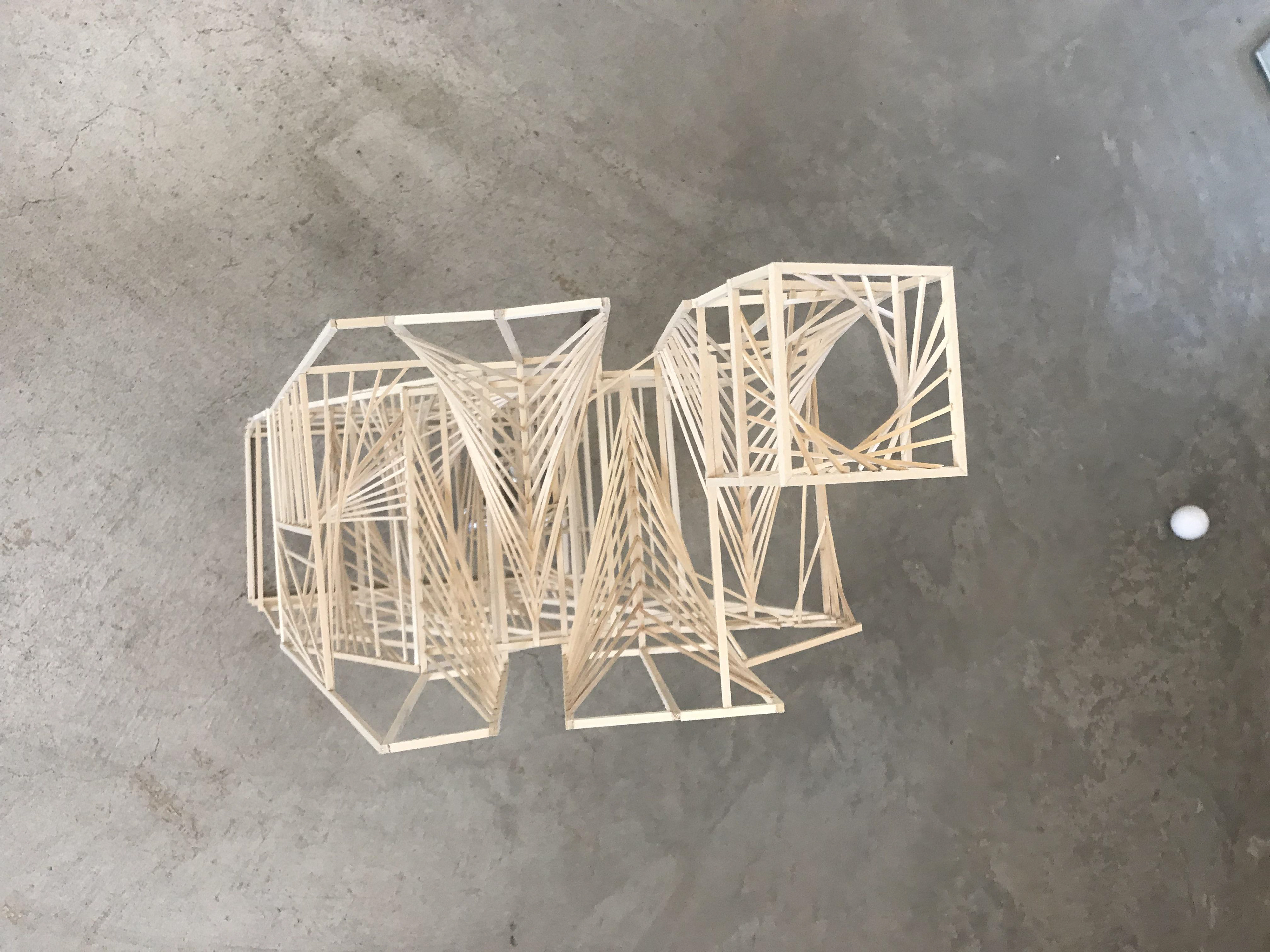 The start of Studio 2 challenged us with a project that involved a moving object to travel from the top to the bottom of a system we built. We were then assigned one of five ordering systems; grid, radial, linear, cluster, or centralized. I was assigned the grid system. I developed the grid ordering system to appear less as a grid but rather as curves. I created the curves with a simple grid, connecting the furthest point from the origin to the nearest point to the origin, then the second furthest to the second closest, and so on. The ball would then roll back and forth along the curves through the system.